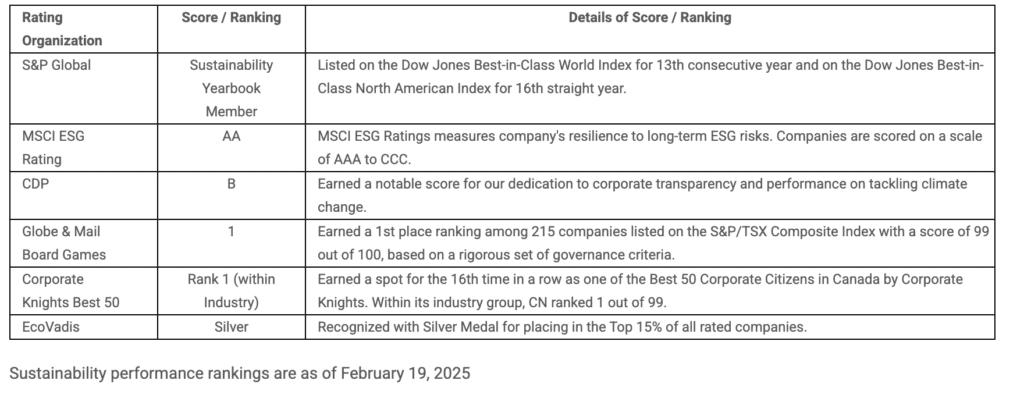 A list of CN’s key sustainability ratings in the past year is highlighted below.