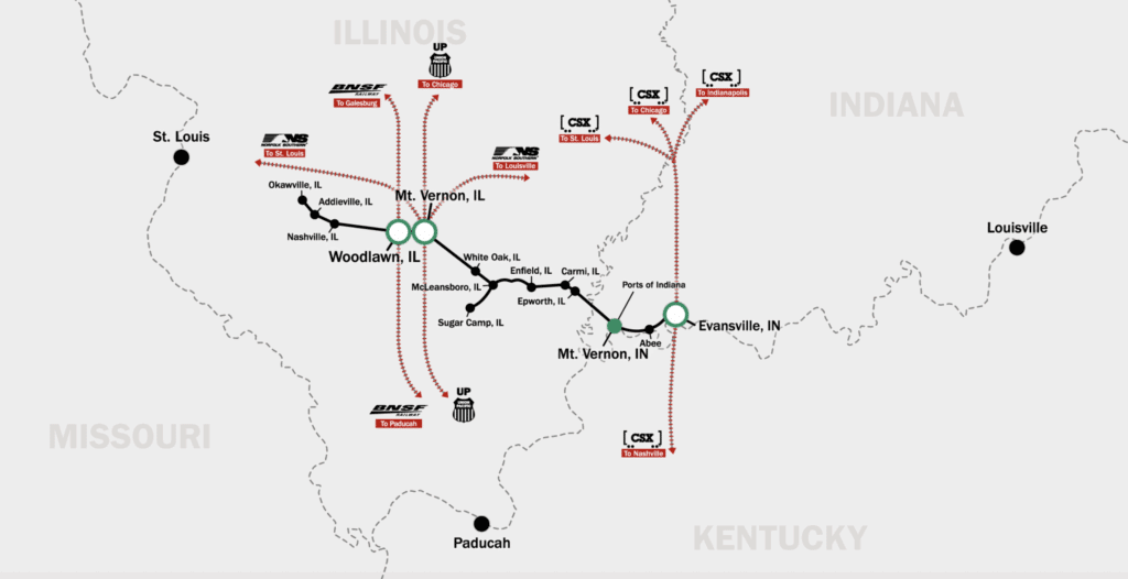 As part of an incentive package, the State of Illinois provided $2.5 million in infrastructure for a new rail spur, which provides direct access to Southern Illinois’ rail network, as well as the ability to easily move goods across the country. The area is served by Evansville Western Railway, which connects with UP, BNSF, Norfolk Southern, and CSX (see map below).