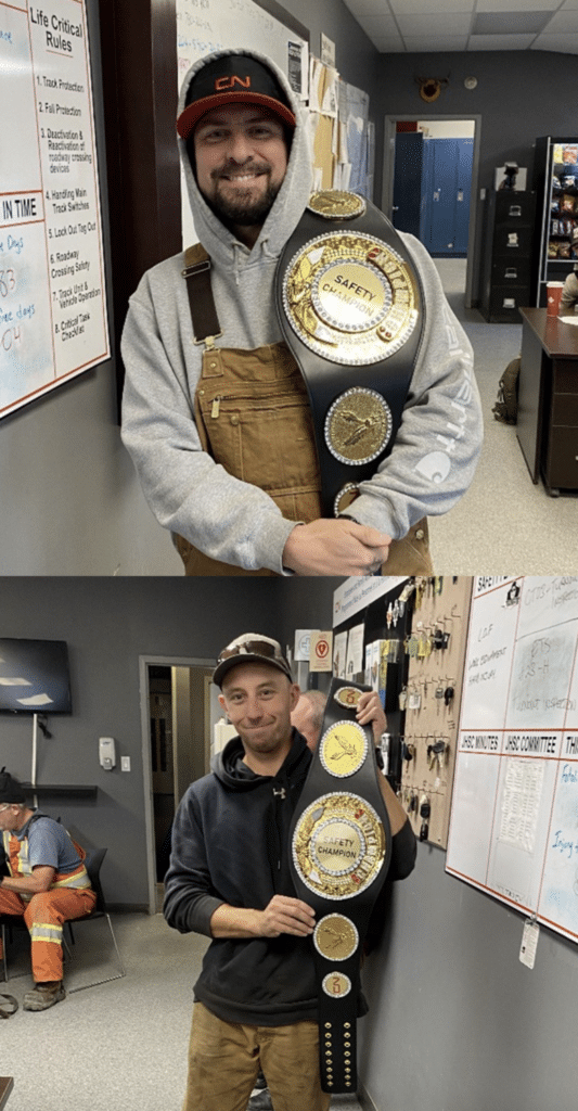 Enter the Safety Champion belt, which CN called “a heavyweight symbol of commitment to safety, teamwork, and looking out for each other.” The belt gets passed every month to a new titleholder, “ready to defend the team’s winning streak of keeping safety first,” according to the railroad, which said that the “reigning champ hands off the belt during the job safety briefing, sharing why their colleague deserves it.”
