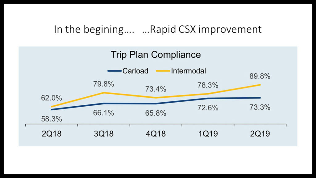 CSX argues that its service delivered performance is getting better. As measured by trip plan compliance (CSX calls it TPC)—as the success in meeting end-to-end customer commitments based on estimated times of arrival—CSX’s service performance at the carload level had actually statistically improved initially from the low-60% range to the mid-80% range. From a CSX quarterly investor presentation: