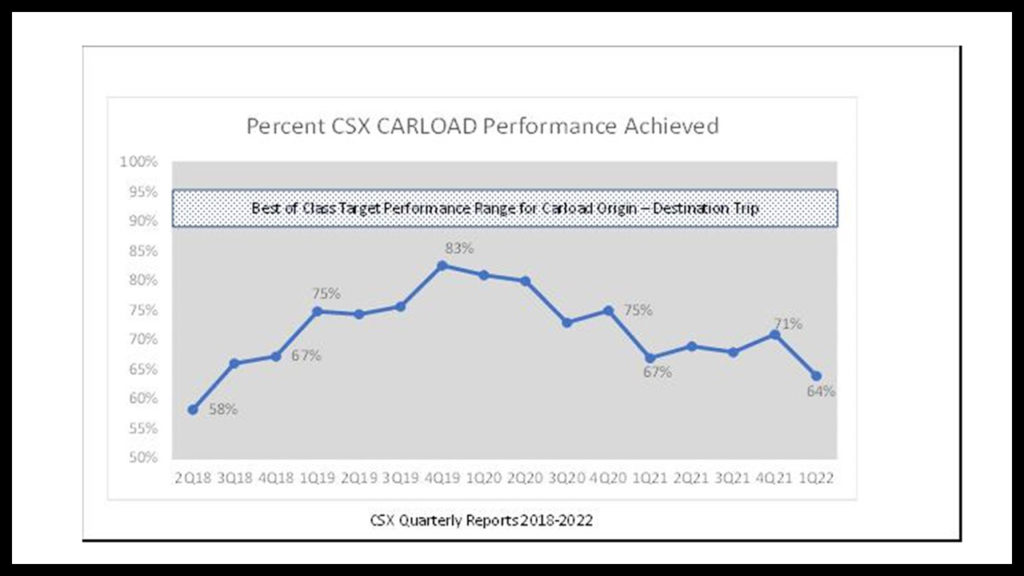 Between the second quarter of 2018 and the fourth quarter of 2019, CSX carload freight showed remarkable and near-constant improvement in reliable delivery, from a woeful 58% average to an impressive 83% delivery pattern. Then, something went wrong. There was a near-constant reliability failure pattern except for the fourth quarter of 2020. Throughout 2021, CSX carload performance experienced a hovering-like line slope in the relatively poor 67% to 71% range–and then into 2022 dropped below the third quarter of base year 2018 delivered performance.