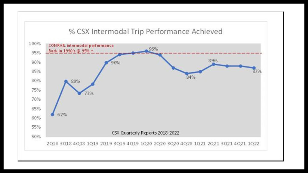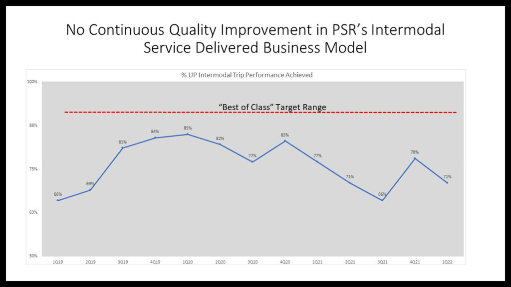 CSX’s intermodal trip performance under introduction of its U.S. PSR business model (previously widely used on CN and CP in Canada) demonstrated a remarkable rapid improvement. Note the upward slope of the graph line from the really poor 62% performance to 96% in just seven quarters. Yes, impressive.