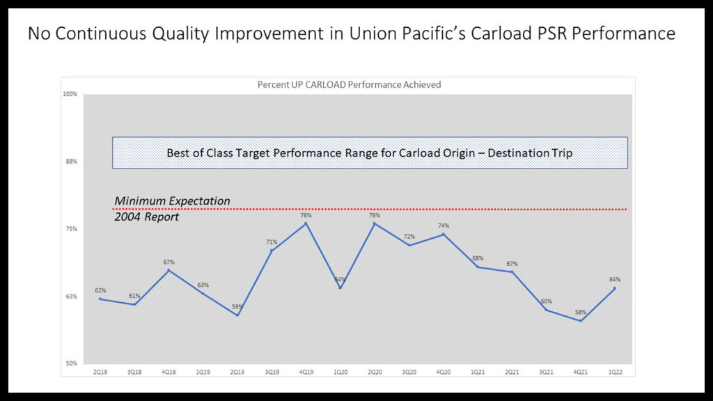 Union Pacific’s saw-tooth up and down Carload trip performance suggests that there may be no correlation statistically with its implementation of its version of the PSR business model. The fourth quarter of 2021–if computed correctly by UP staff–is an embarrassing 58%. That’s below its startup period dated the third quarter of 2018. If UP was performing as many railroad operations simulation researchers would have expected by now, its carload business should be in the 80% to 88% range–or higher if its model was a superior tool.