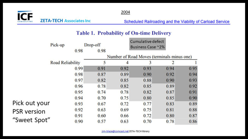 In the FRA-published ICF and Zeta Tech Associates report from 2002-04, you can clearly see that a carload movement across two terminals ends up with just a near 92% on-time predictable reliability. Expand that network to a movement across or through four terminals and the probable on-time final delivery of carload cargo drops to about 89% as promised. Thus, the 2% origin pickup and 2% destination delivery segments are assuming a near-perfect main trunk line 2% error rate (98% on time).