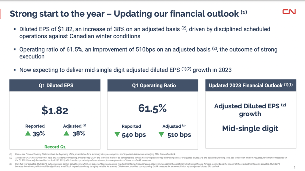 - Diluted EPS of C$1.82, a 39% increase (or a 38% increase on an adjusted basis) over first-quarter 2022. The Canadian Class I said this was “driven by disciplined scheduled operations against Canadian winter conditions.”