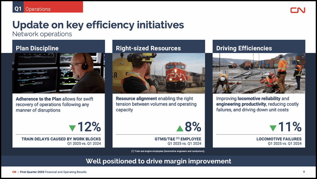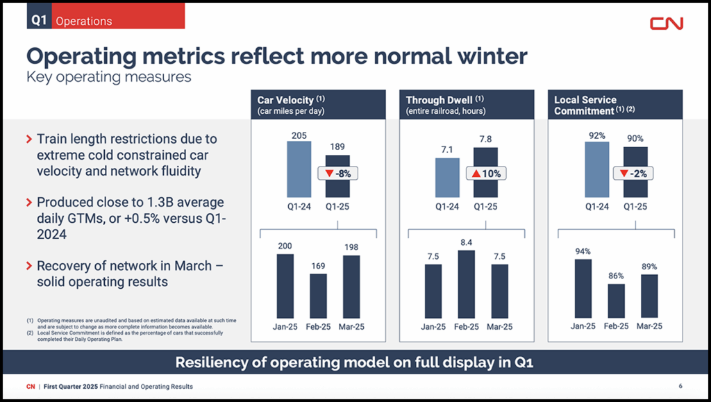 CN reported that its first-quarter 2025 operating metrics reflected a “more normal winter.” Train length restrictions due to “extreme cold constrained car velocity and network fluidity.” Car velocity came in at 189 car miles per day, down 8% from first-quarter 2024’s 205. Through dwell on the entire railroad was 7.8 hours, up 10% from first-quarter 2024’s 7.1 hours. CN’s local service commitment, defined as the percentage of cars that successfully completed their Daily Operating Plan, was 90% in first-quarter 2025, down 2% from the prior-year period’s 92%.