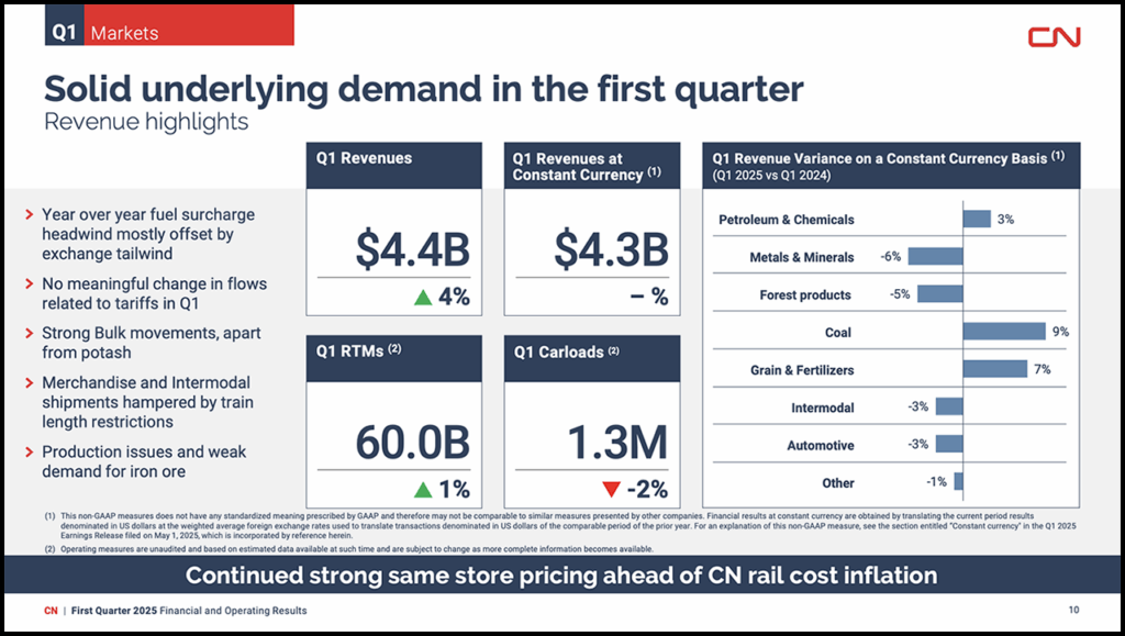 - Revenues of C$4.403 billion were up C$154 million, or 4%, from first-quarter 2024’s C$4.249 billion. The railroad reported “solid underlying demand.” For the three-months ending March 31, 2025, the “year-over-year fuel surcharge headwind [of C$0.05 was] mostly offset by exchange tailwind”; there were ‘no meaningful changes in flows related to tariffs”; there were “strong Bulk movements, apart from potash”; Merchandise and Intermodal shipments were “hampered by train length restrictions”; and there were “production issues and weak demand for iron ore.”