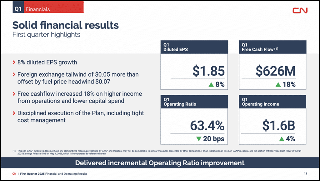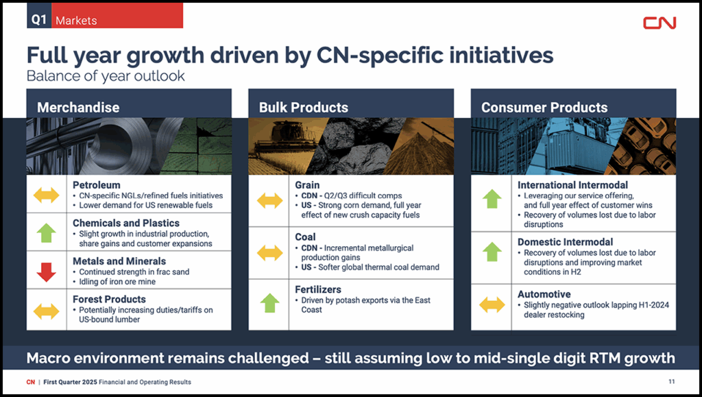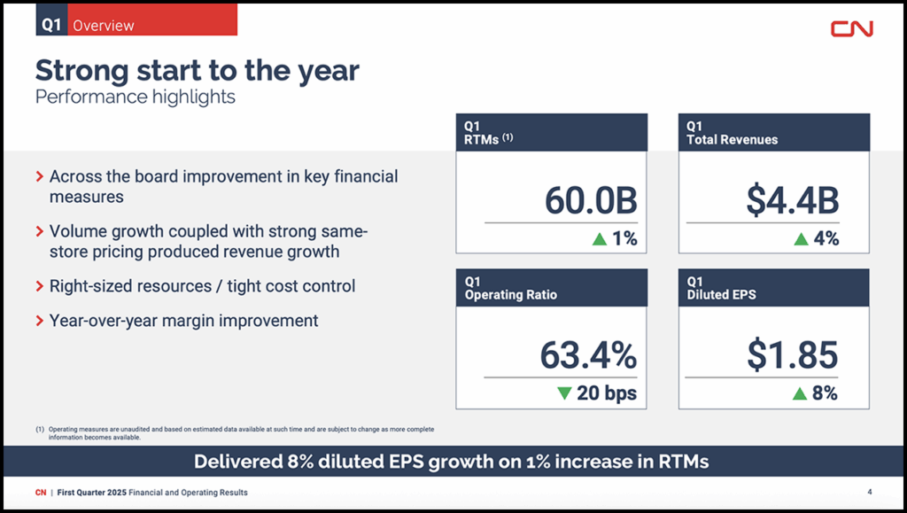 “Our team delivered a strong performance this quarter through tight cost control and disciplined adherence to our plan, mitigating the impact of winter conditions,” CN President and CEO Tracy Robinson said in a first-quarter 2025 report. The railroad had 8% diluted EPS growth on a 1% increase in RTMs (revenue ton miles). While its full-year guidance and 2024-2026 financial outlook remain unchanged, the Canadian Class I noted that “there is a heightened recessionary risk related to tariffs and trade actions taken by various countries.”