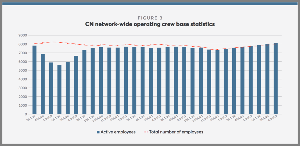 • Developing and preparing the workforce. CN said its overall employee count was 850 higher as of the end of June versus the beginning of the year, with most of the increase in operating crew ranks. The Class I is expected to graduate 500 additional new conductors through the end of 2022. Additionally, rail operating rules-qualified managers are slated to be “available to protect rail traffic movement and support operations during challenging winter operating conditions.”