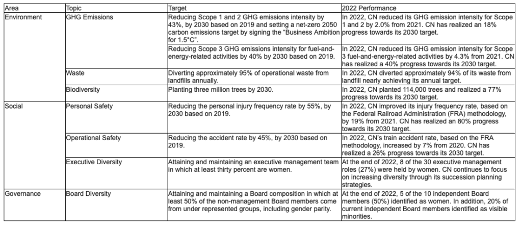 CN’s key ESG (environmental, social and governance) targets and 2022 progress include: