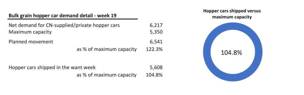 For week 19, CN reported that it planned 6,217 bulk hopper cars, representing more than 100% of the maximum end-to-end sustainable grain supply chain capacity. This total, the Class I says, is net of any orders canceled by customers, after order placement in week 18 during week 19.