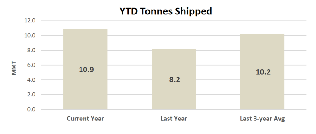 CN reported that it moved 10.9 million metric tons (MMT) of western Canadian bulk grain through week 19. This tonnage, the railroad says, is 7% higher versus the average of the prior three years, and 33% above last year.