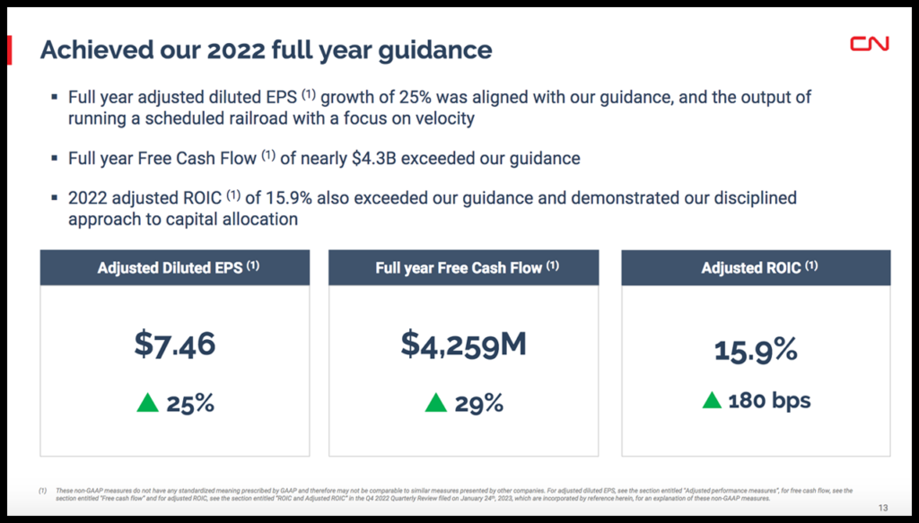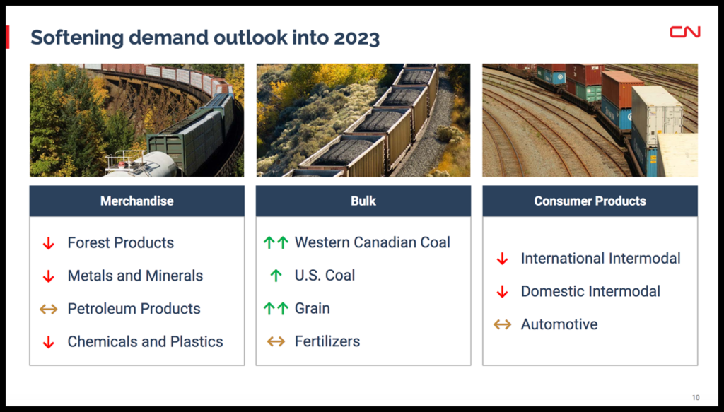 CN said it expects to deliver EPS growth in the low single-digit range “due to a softer economic outlook.” North American industrial production is assumed to be negative in 2023, according to the railroad.