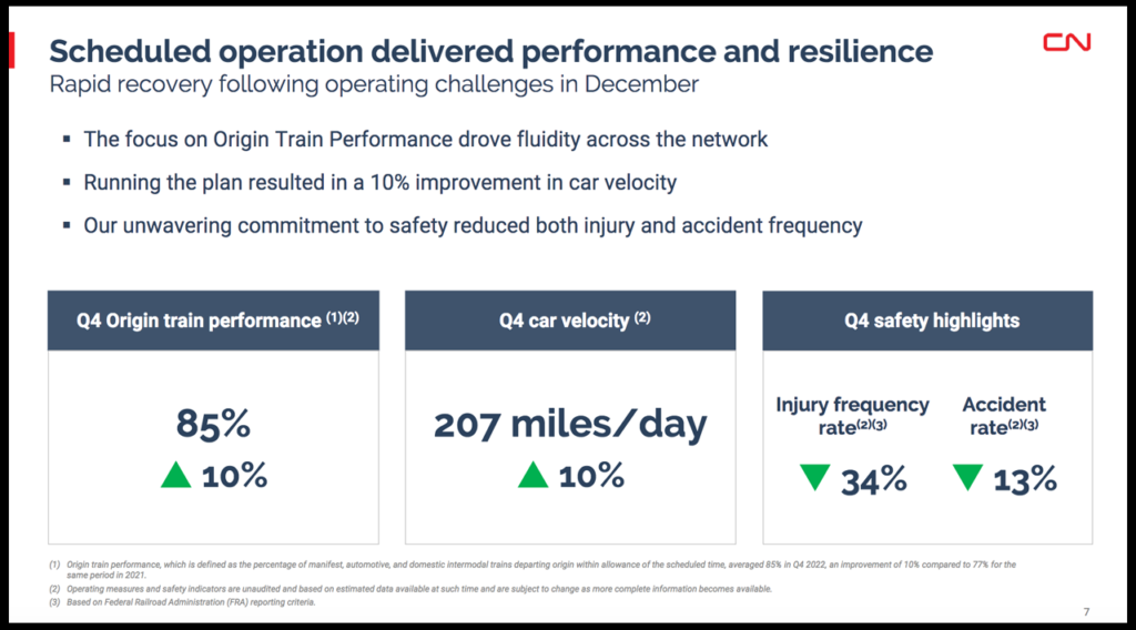 • On the operations side, fuel efficiency improved by 1% to 0.886 U.S. gallons of locomotive fuel consumed per 1,000 gross ton miles (GTMs); car velocity (car miles per day) improved by 10%; through network train speed (mph) improved by 1%; through dwell (entire railroad, hours) improved by 9%; and train length (in feet) decreased by 7%, compared with fourth-quarter 2021.