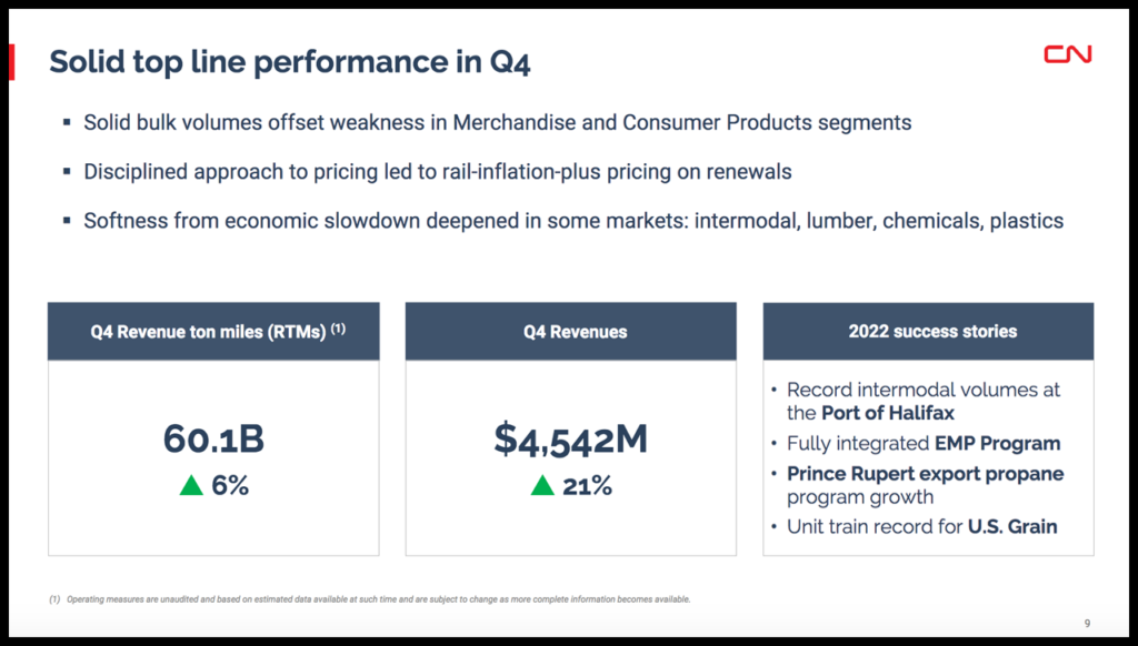 • “Fourth-quarter volumes grew 2.5% year-over-year on historically strong Canadian crop movement and continued demand for coal due to energy shortages. Strong bulk freight and easy comps are expected to support first-half volume growth. Weakness is expected on the intermodal side due to softening demand and although automotive freight supported fourth-quarter volumes, management anticipates a draw-down due to rising interest rates and spare parts shortages. Like Union Pacific, management issued a cautious volume guide of outperforming national industrial production and emphasized low second-half visibility.