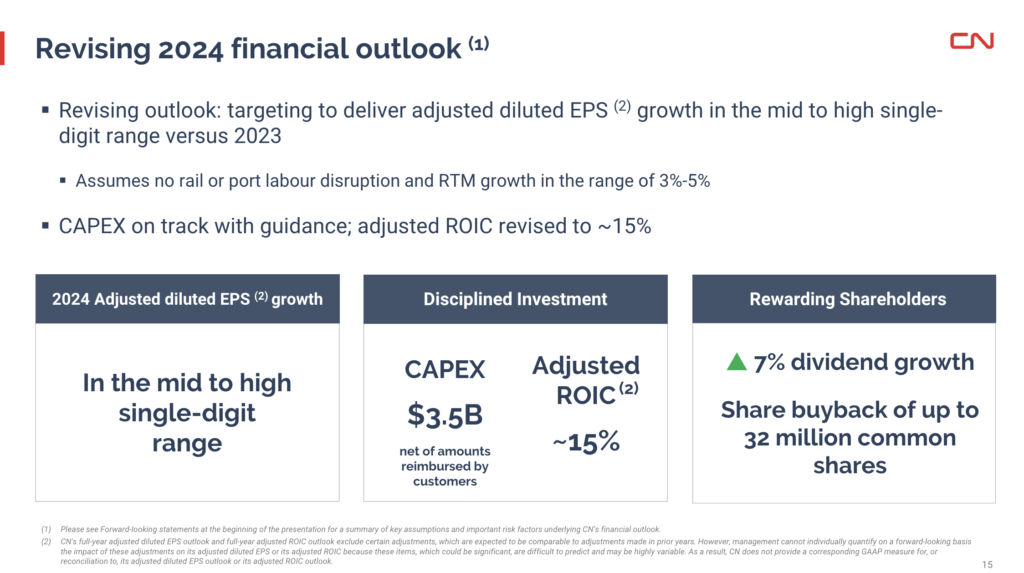 Accounting for second-quarter 2024 results and the ongoing volume impact of the current labor uncertainty, CN says it “now expects to deliver adjusted diluted EPS growth in the mid to high single-digit range (compared to its April 23, 2024, expectation of approximately 10%). CN also “continues to expect to invest approximately C$3.5 billion in its capital program, net of amounts reimbursed by customers.” Additionally, CN now expects adjusted return on invested capital (ROIC) to be “approximately 15% (compared to its April 23, 2024, expectation to be within the targeted range of 15%-17%).”
