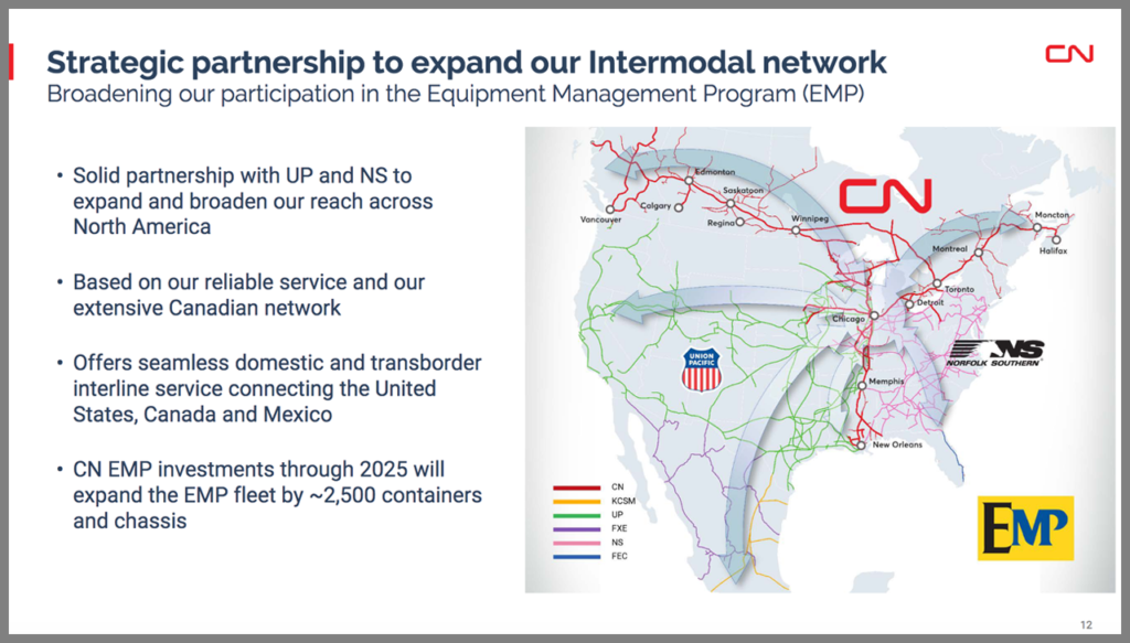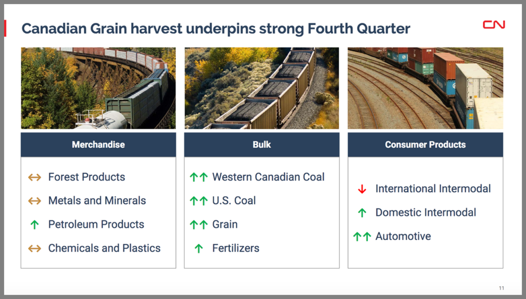 Diluted EPS came in at C$2.13, a decrease of 10%, which CN said was “mainly due to a merger termination fee received in the third quarter of 2021.” Diluted EPS was up 40% on an adjusted basis, which represents a quarterly record, the railroad noted.
