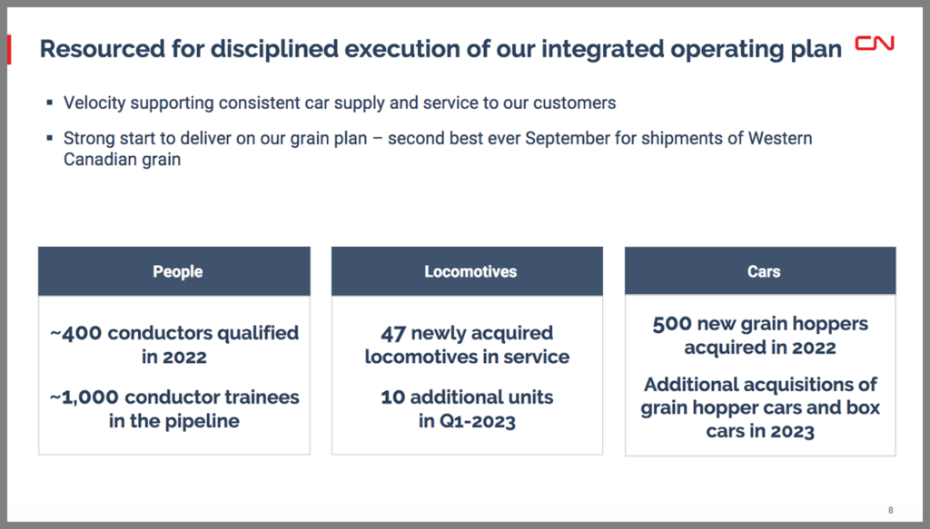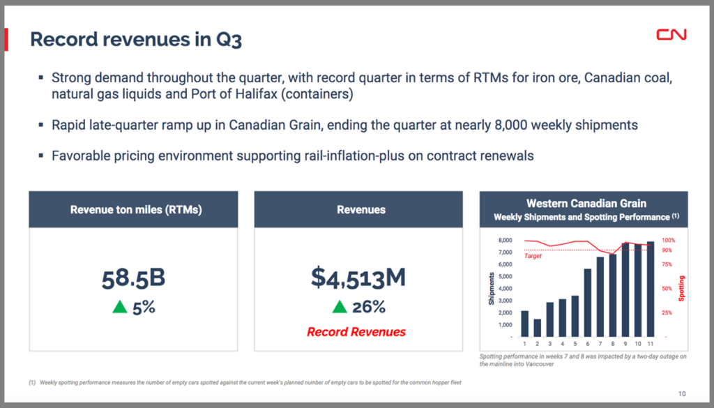 CN reported “record” operating income of C$1.932 billion, an increase of 44%, or an increase of 31% on an adjusted basis, which includes a C$47 million wage accrual for the tentative agreement reached with U.S. unions, vs. third-quarter 2021.
