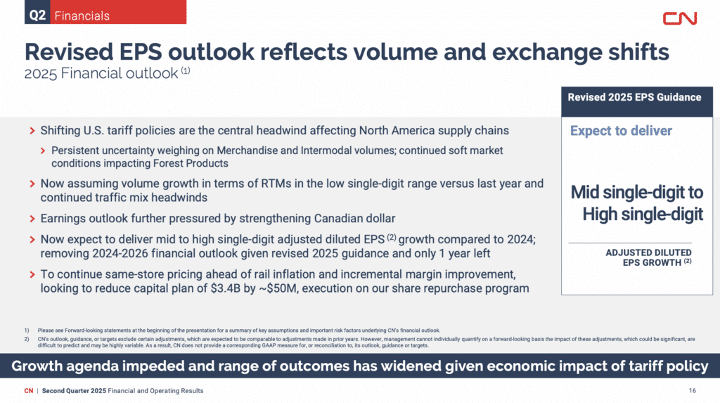 “Given the Company’s updated guidance for 2025, and the continued high level of macroeconomic uncertainty and volatility related to evolving trade and tariff policies, CN is removing its 2024-2026 financial outlook,” the Class I announced.