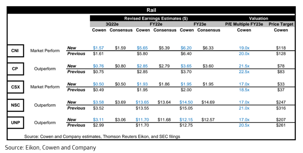We adjust our 2023 EPS assumptions downward for the railroads, on our assumption that rail congestion and volume challenges will bleed into 2023, coupled with higher costs of operations. With rail contracts approximately three years, near-term margin dilution may play out in 2023 as labor and materials costs increase across the board.