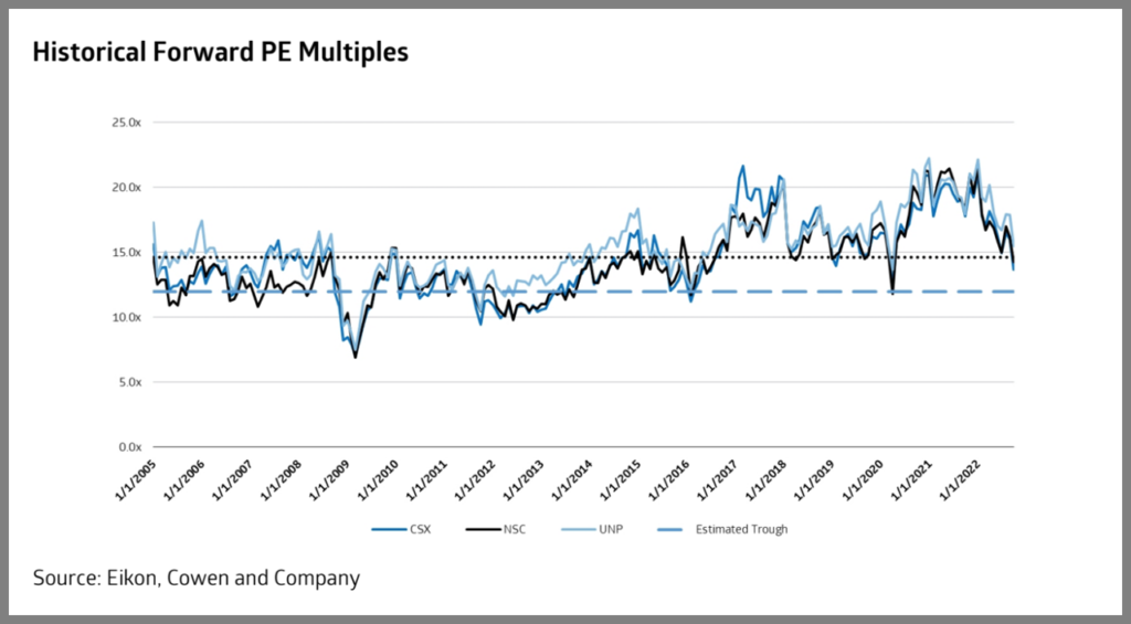 We are lowering our U.S. rail multiples down to 17x to be more in line with historical averages; labor negotiations and elevated costs may squeeze operating ratio in 2023 amid a weakening economic backdrop. We note that by bringing down multiples by a turn, CSX, NS and UP all are above the combined approximately 20-year historical average of about 15x, while in line with the five-year historical averages of about 17x.