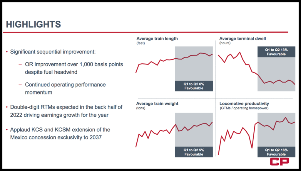 Looking ahead, CP said it was “ready and resourced to move double-digit volume growth in the back half.” Additionally, the Surface Transportation Board’s review of its proposed merger with KCS—creating Canadian Pacific Kansas City (CPKC), the first single-line rail network linking the U.S., Mexico and Canada—was “on track” for a decision in first-quarter 2023, the railroad reported. It added that the KCS and KCSM concession exclusivity 10-year extension to 2037, announced earlier this month, “provides long-term certainty for [the] proposed CPKC merger.”
