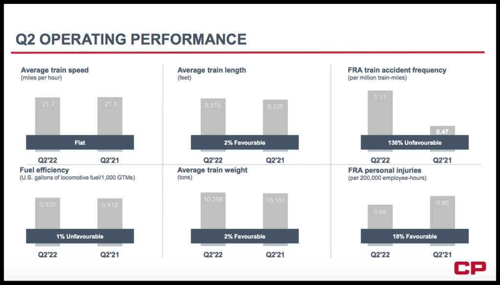 • Revenues came in at C$2.20 billion, up 7% from the same period in 2021 (C$2.05 billion). Bulk was up 40%, according to CP, which reported there was a “continued record performance in U.S. grain”; “improved crop conditions in Canadian grain,” with current expectations for an “average-sized crop and fourth-quarter harvest”; and “double-digit” Potash volume growth in second-half 2022. Merchandise was up 38%, and CP noted there was “continued strong demand in automotive as dealers replenish inventory levels.” Intermodal was up 22%, and CP said it expects “double-digit volume growth” in the back half of 2022. Revenue ton-miles (RTMs) were down 2% and freight revenue per RTM was up 10% from the prior-year period.