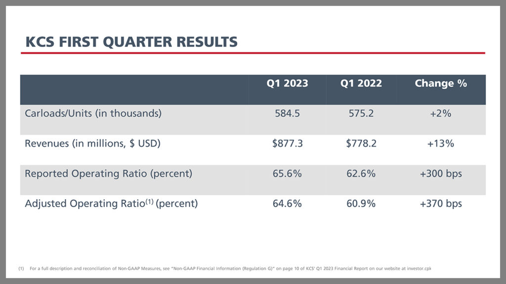 In the first quarter of 2023, revenues increased 23% to $2.27 billion, from $1.84 billion in 1Q22. Volumes, as measured in revenue ton-miles, increased 11%. Reported OR improved by 750 basis points to 63.4%, from 70.9% in 1Q22. Adjusted OR improved 690 basis points to 62.9% from 69.8% in 1Q22. Reported diluted EPS increased to $0.86, from $0.63 in 1Q22. Core adjusted diluted EPS increased to $0.90, from $0.67 in 1Q22.