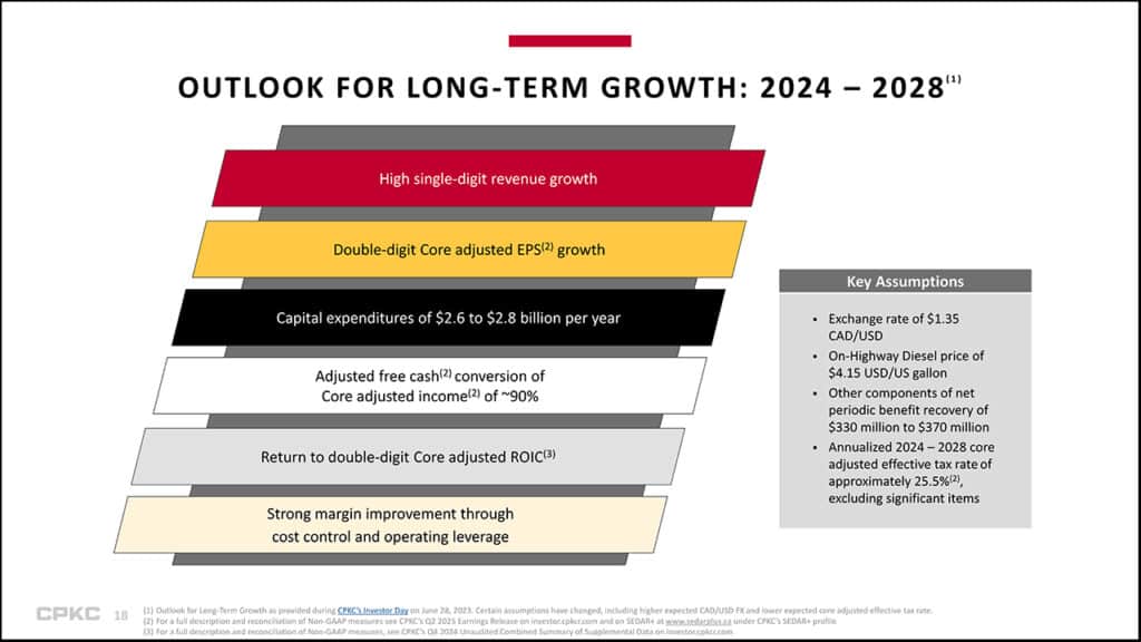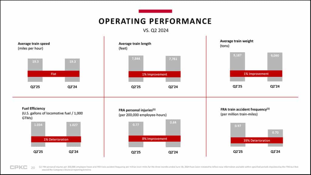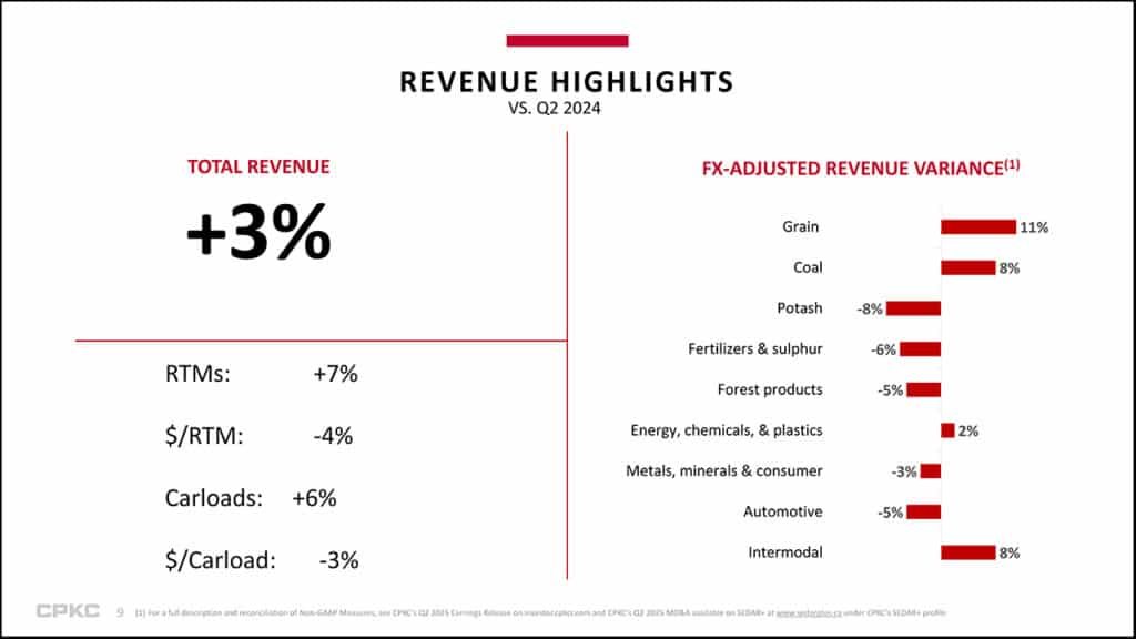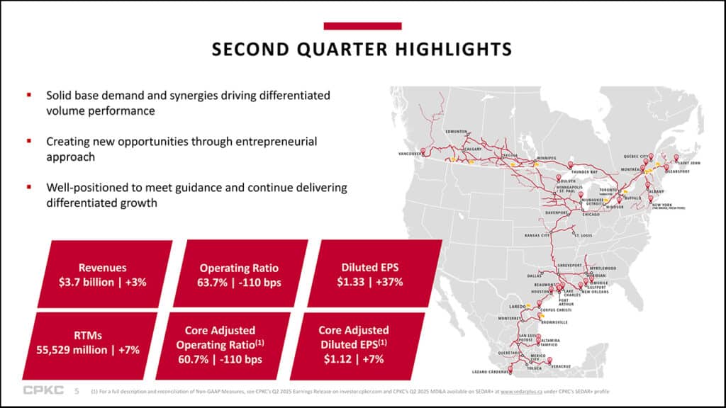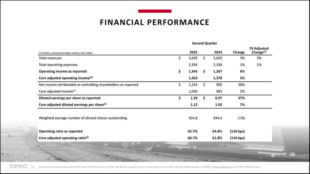 CPKC volume, measured in RTMs (revenue ton-miles), increased 7%, compared to 2Q24. Revenues increased 3% to C$3.7 billion from C$3.6 billion. The reported operating ratio (OR) decreased 110 basis points to 63.7% from 64.8%. The core adjusted OR decreased 110 basis points to 60.7% from 61.8%. Reported diluted EPS increased to C$1.33 from C$0.97. Core adjusted diluted EPS increased7% to C$1.12 from C$1.05. Federal Railroad Administration (FRA)-reportable personal injury frequency decreased to 0.77 from 0.84; however. FRA-reportable train accident frequency increased to 0.97 from 0.70.