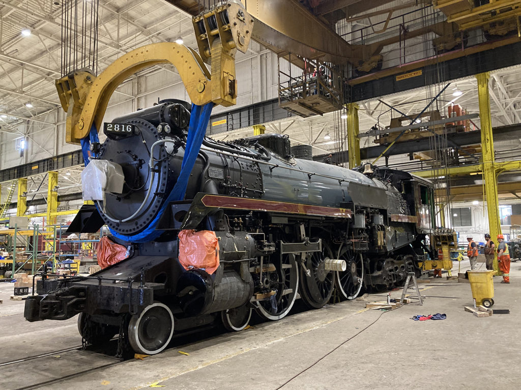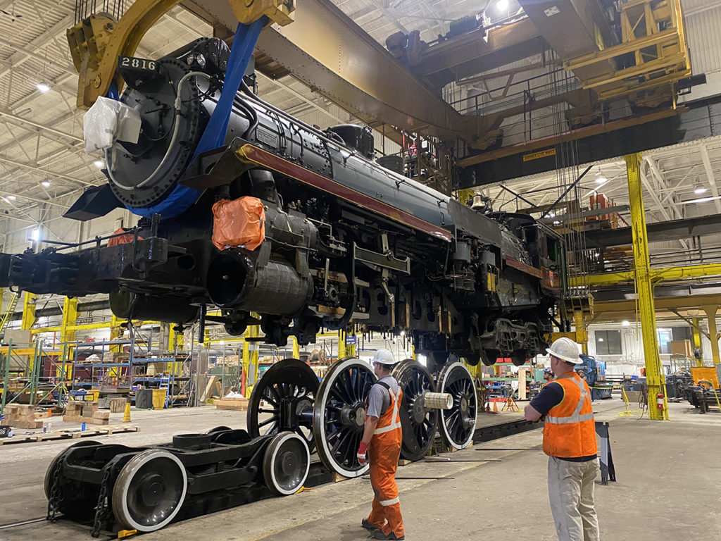 2816, a 4-6-4 Hudson-type steam locomotive, was built in 1930 by Montreal Locomotive Works. It served as a “roving steam-powered ambassador” for Canadian Pacific (CP) throughout Canada and the U.S. before being placed in storage in 2012, according to CPKC. Recently, the locomotive’s boiler/firebox/cab assembly was reunited with its pilot truck, drivers and trailing truck, and the unit completed a stationary steam test. It has been undergoing main line testing. CPKC said it continues to undergo preparations for next year’s long-distance tour, including being equipped with Positive Train Control.