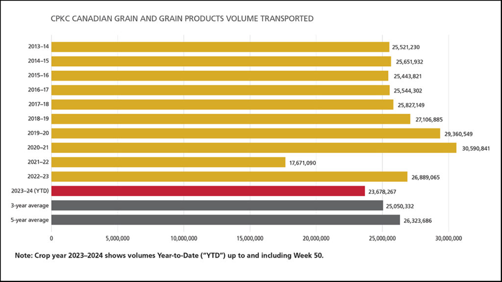 - “If the grain supply chain uses this available weekly capacity effectively, then CPKC expects to supply the capacity required to transport nearly 34 MMT of Canadian grain and grain products throughout the crop year, subject to market demand. This performance target is contingent on all elements of the supply chain, including grain customer terminals, ports, and vessels, operating with maximum efficiency, reliability, predictability, and balance throughout the duration of the crop year. The railway is only one part of a complex, integrated grain supply chain. The supply chain is only as strong as its weakest link.