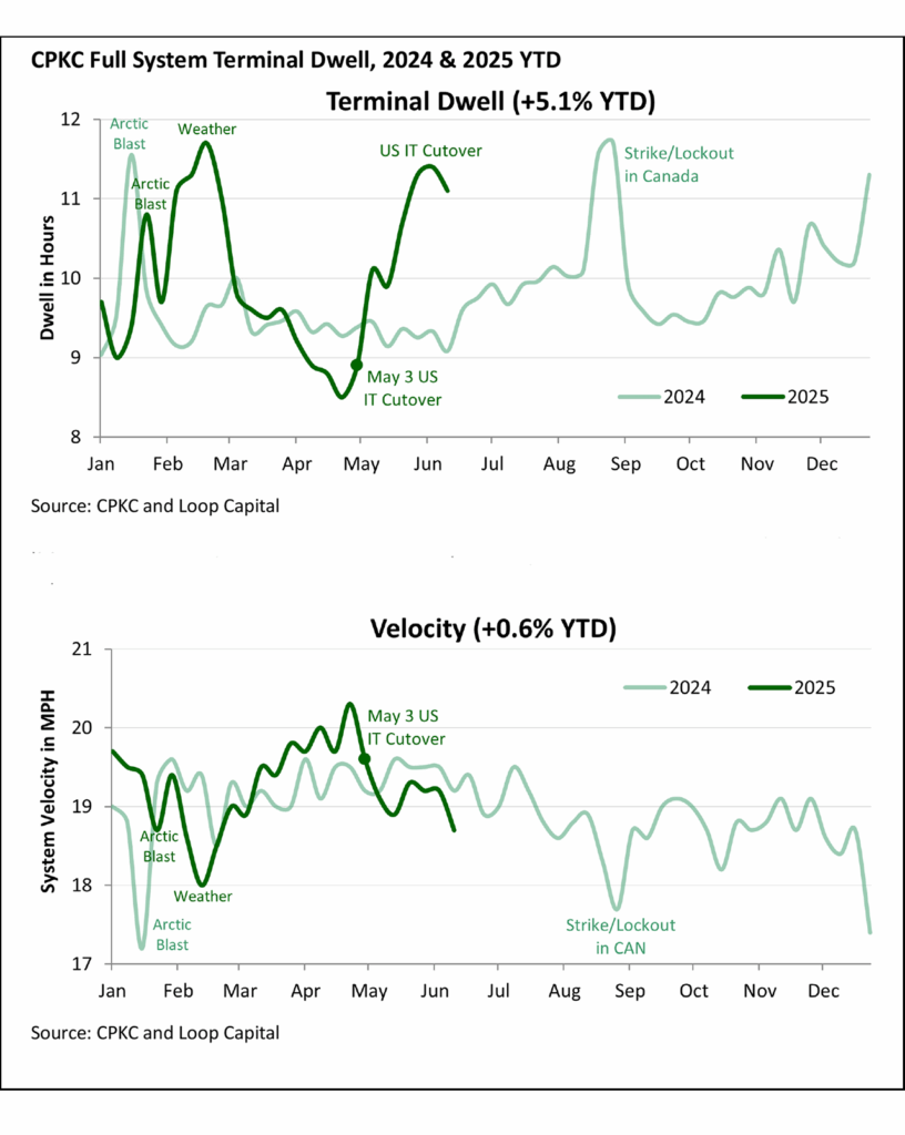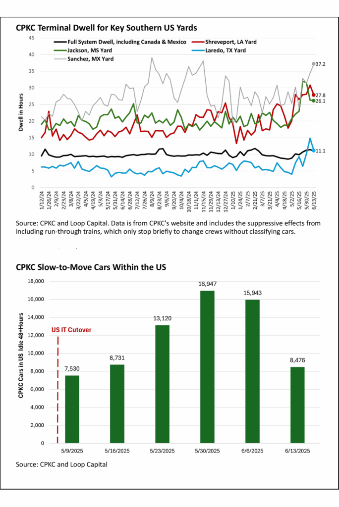 If we switch to full system velocity, we actually see a recent deterioration over the past three reported weeks through June 13. In fact, that last week represented a four-month low. Given the cutover problems have been isolated to CPKC’s southern U.S. territory, we need to find data with more granularity. We’ve done so in recent weeks by looking at dwell at individual, impacted yards, as you can see in the bottom updated chart.