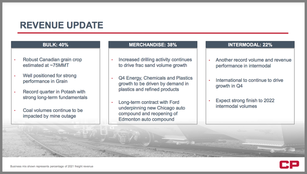 • “We expect volume growth to continue in the fourth quarter and are confident that we should see growth again in 2023 given management’s bullish commentary. CP continues to see volume strength in grains owing to bumper crop (one of the top five all time) in Canada and highlighted that the harvest will produce favorable comps in first-half 2023. Low water levels in the Mississippi will produce a NT tailwind to grain volumes as they force truck to rail