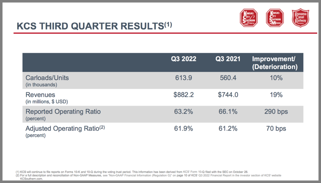• “The company gave an update on the CP/KCS merger and expressed confidence on a positive outcome from the STB in the first quarter of 2023. Recent hearings in D.C. were longer than expected, but management commended the STB’s (who was no doubt listening to the earnings call) detailed approach to reviewing the transaction. KCS continues to make progress in Mexico, highlighting a second bridge in Laredo that could support volume growth in the coming years (52% growth in autos volume in the third quarter support positive export momentum).