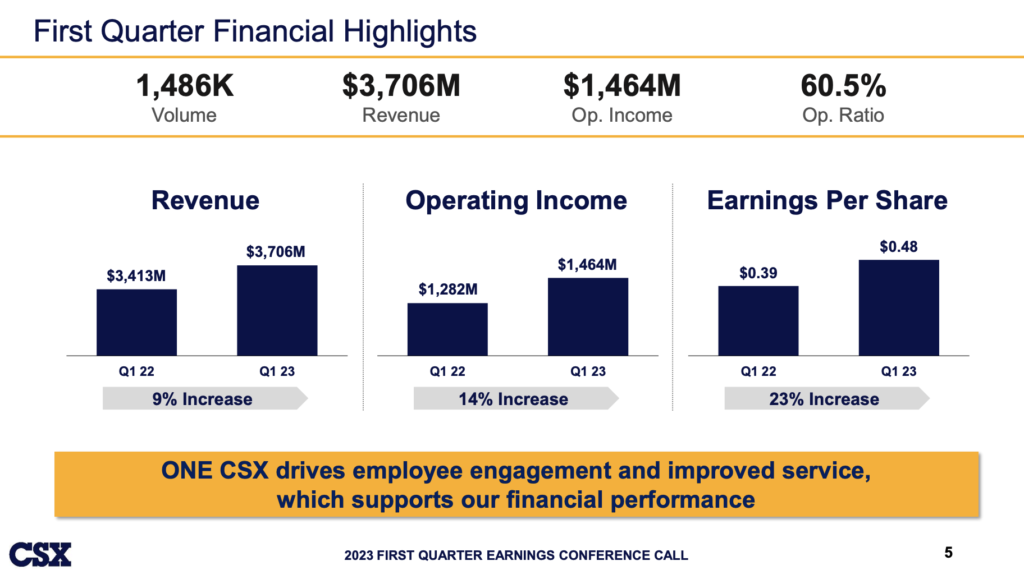 CSX reported first-quarter 2023 operating income of $1.46 billion compared to $1.28 billion in the prior year period; net earnings of $987 million, or $0.48 per share, compared to $859 million, or $0.39 per share, in the same period last year.