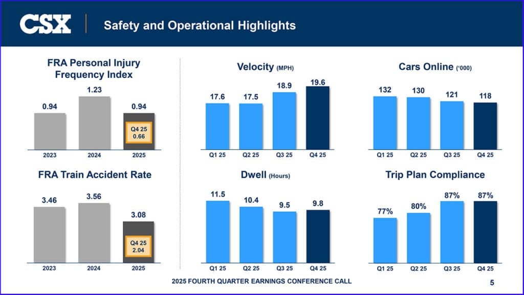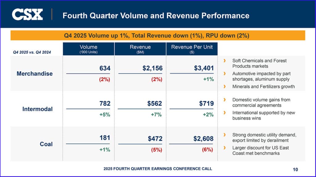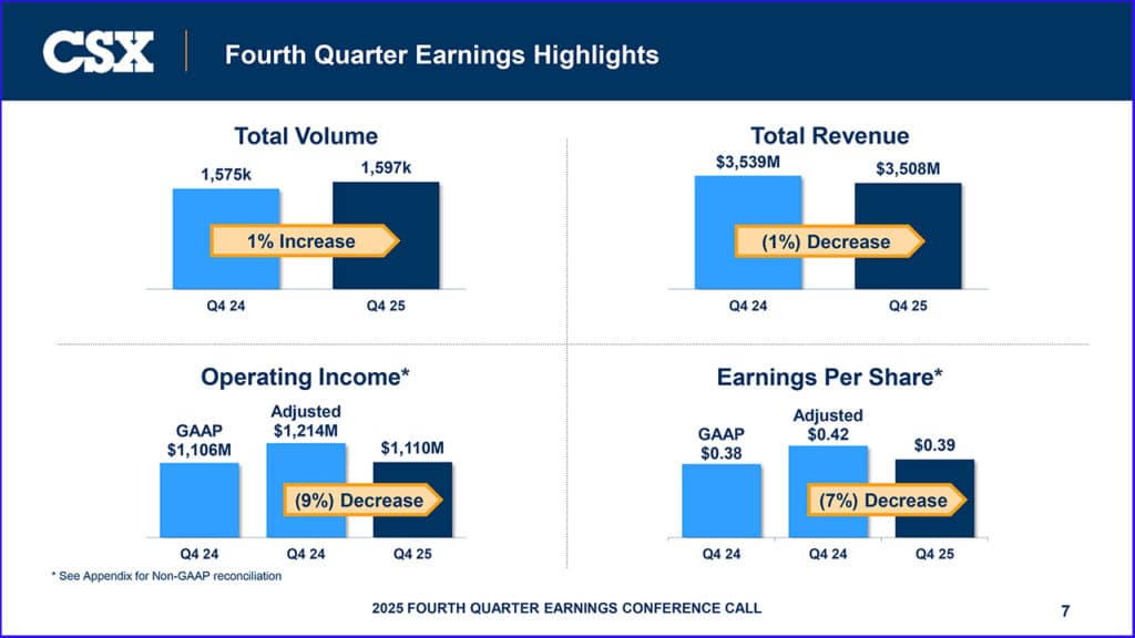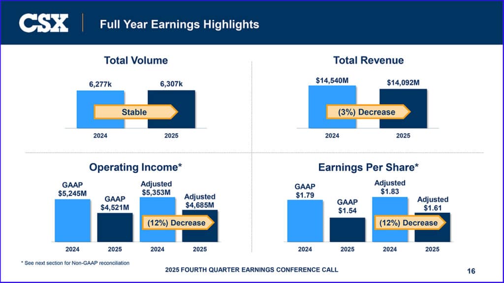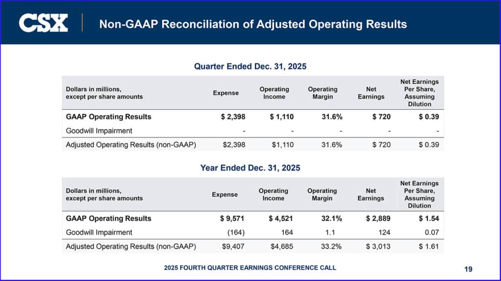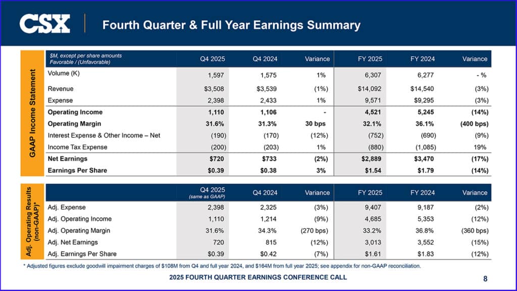 CSX posted 4Q25 operating income of $1.11 billion and net earnings of $720 million, or $0.39 per share, compared to $1.11 billion and $733 million, or $0.38 per share, in 4Q24. Excluding a pre-tax, non-cash goodwill impairment charge, adjusted operating income was $1.21 billion and adjusted net earnings were $815 million, or $0.42 per share, in 4Q24. Fourth-quarter 2025 operating income and earnings per share include approximately $50 million and $0.02, respectively, in “expenses related to severance and rationalization of specific technology investments.” (Download 4Q25 Financial Report below)