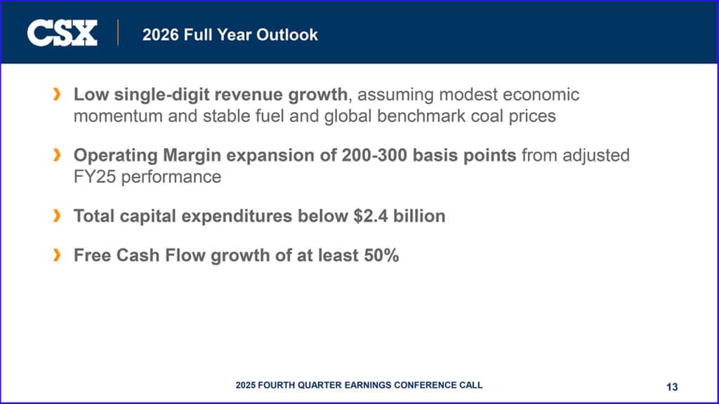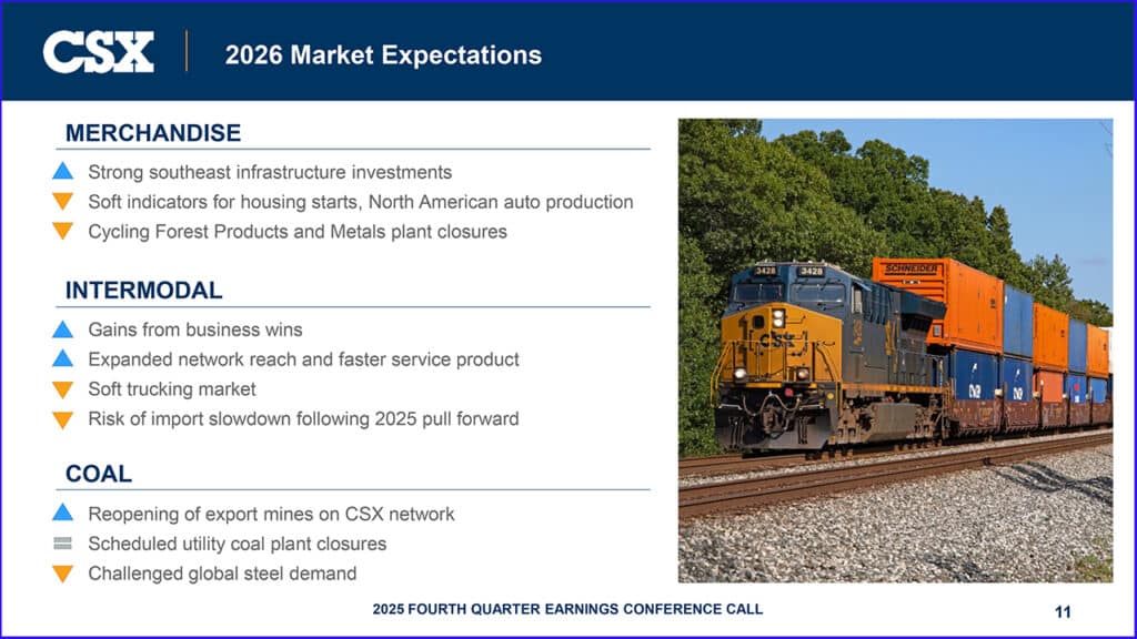 “We’ve finished a challenging year for the industry, marked by subdued market demand, and we’re committed to delivering stronger financial performance in 2026. Service levels have remained high, and we’re taking thoughtful actions to control costs and improve capital efficiency with a focus on profitability and cash flow. CSX’s total volume was slightly higher this quarter, driven by our intermodal franchise that achieved a 5% year-over-year increase in volume. We’ve been winning new intermodal business as we’ve brought faster transit times and more connectivity to our customers. As we plan for 2026, we do not anticipate any meaningful improvement in macroeconomic conditions. We will stress execution of our own initiatives and will be ready when the market finally turns. We maintain a solid pipeline of growth initiatives, including nearly 600 industrial development projects, and continue to benefit from consistent infrastructure activity in our key regions. Our guidance for the upcoming year is for modest revenue growth, solid margin expansion, and a substantial increase in free cash flow.”