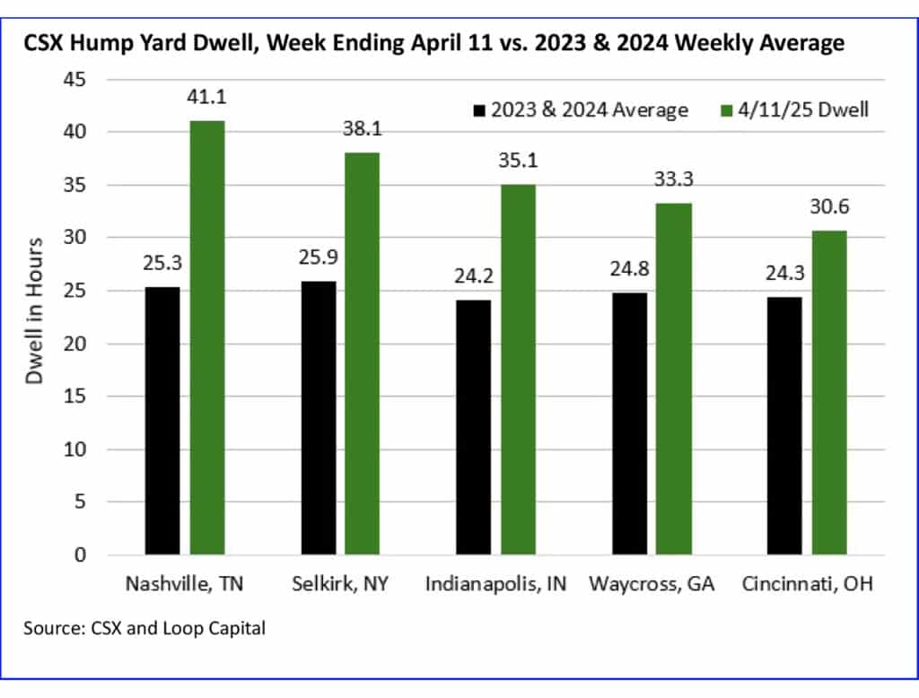 There’s two metrics we want to focus on. The first is the average dwell for CSX’s five hump yards, which jumped in the week ending April 11 to 35.6 hours from 32.9 hours the week prior. The chart below shows each yard’s current dwell compared to the weekly average across 2023 and 2024. It’s not a pretty picture. These yards typically process cars in one day (25 hours), but they’re now taking a day and a half (36 hours). It’s also no surprise the Nashville yard is currently the worst, as the recent flooding took out the line between Nashville and Louisville. Also, remember that Waycross is the most important, as it’s the southern hub with the highest throughput.