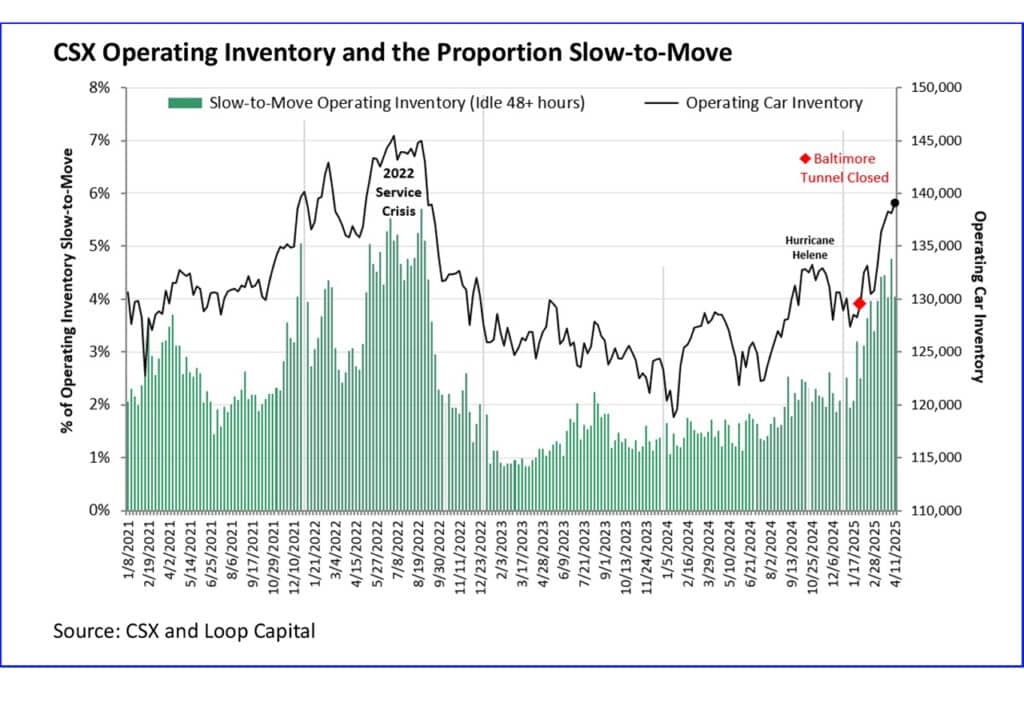 We need to have a realistic timeframe for CSX’s operational recovery due to the operating inventory issue above. It always takes longer to get out of the ditch than it took to fall into it. The network has been deteriorating fairly consistently since the Howard Street Tunnel was closed on Feb. 1, and that was 11 weeks ago. What if it takes 15 weeks to recover? That puts us into August. If you’re a CSX stockholder, Labor Day is a more prudent assumption of when CSX likely gets back to some semblance of normal.