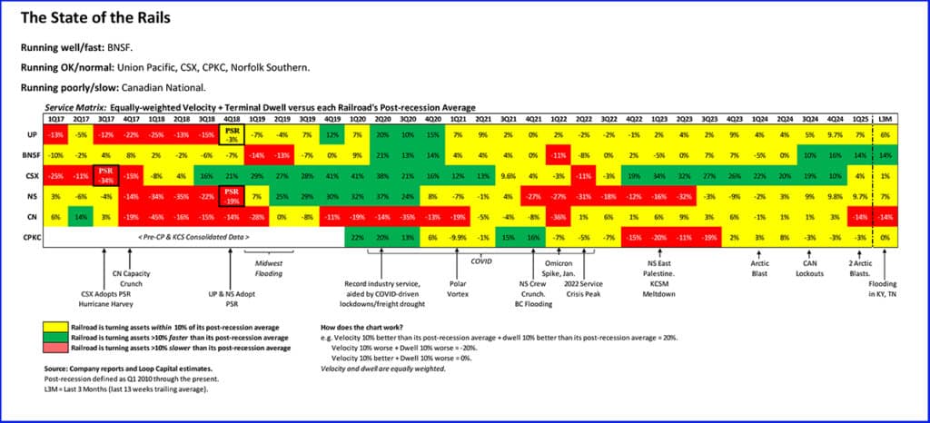 A decelerating railroad acts like a giant magnet, sucking in more train crews, locomotives and railcars to move the same amount of freight. The problem is that the railroad only truly controls the first two: crews and power. Most of the cars are owned or leased by the customers, and to ensure adequate deliveries of product, they throw more assets onto the system as it slows, which increases congestion and slows it even more. It takes a long time to reverse this process. The railroad first has to adhere to the First Law of Holes—stop digging, and once the system is stabilized, marketing and operations then need to work the phones to cajole frustrated and reluctant customers into pulling some of their cars off the system. It’s basically a “trust me” moment. Some customers will (due to good service in 2023 and 2024), and some won’t (2022 still too fresh in their minds).