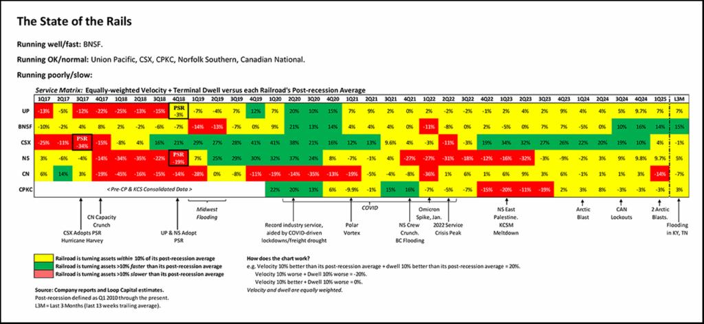 The one key metric that isn’t quite cooperating is velocity; specifically intermodal velocity, which remains 7% lower than where it was prior to the Howard Street Tunnel closure Feb. 1. This makes sense because the impacted I-95 corridor was intermodal-heavy. Likely, there’s a lower velocity ceiling now in place until the reroutes are removed (~4Q2025).