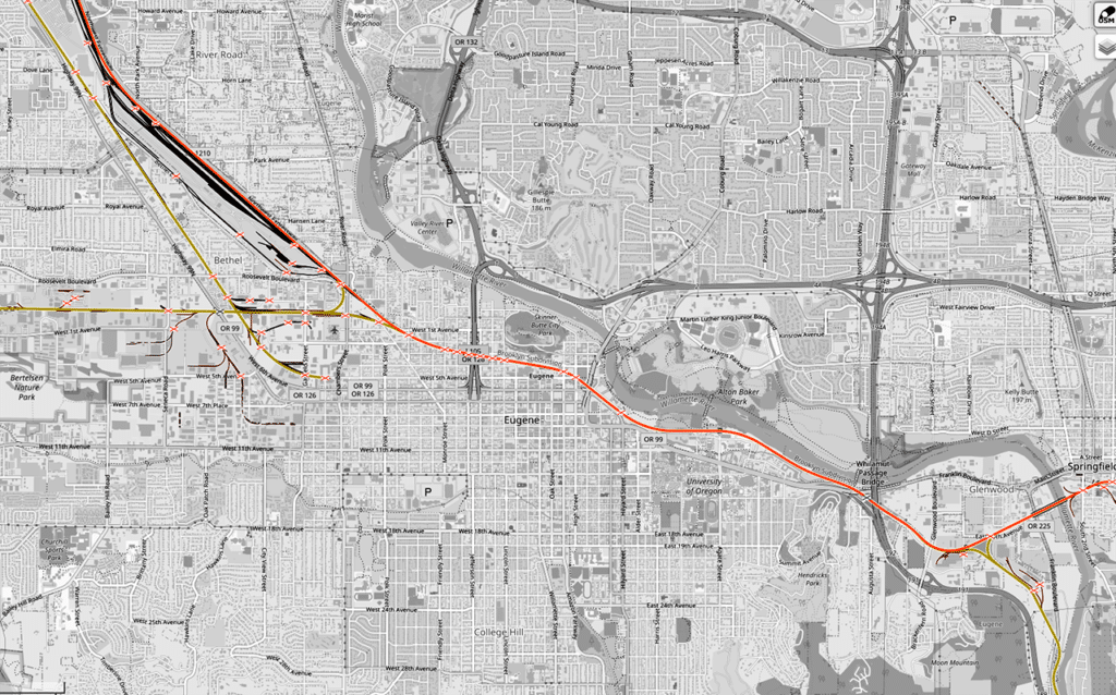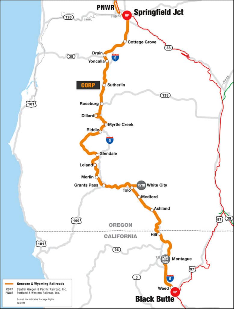 CORP, which G&W acquired in 2012 as part of its purchase of RailAmerica, operates 306 miles of line, 58 in California, 248 in Oregon. The railroad interchanges with Union Pacific at two locations—Eugene, Ore. (Springfield Junction, UP Brooklyn Subdivision) and Black Butte, Calif. (UP Black Butte Subdivision)—and with Flat Iron Rail at Montague, Calif.; and Rogue Valley Terminal Railroad, White City, Ore.