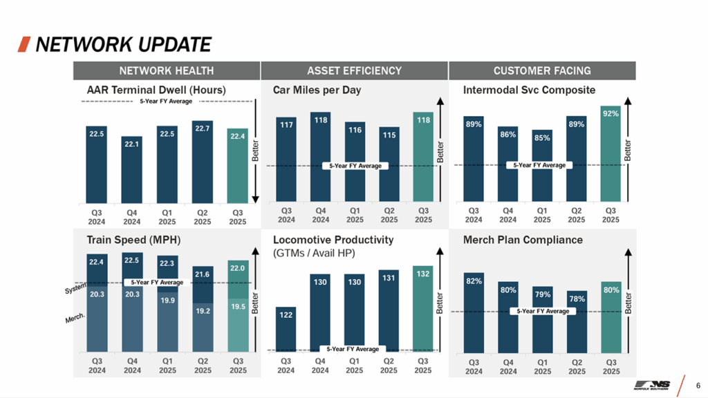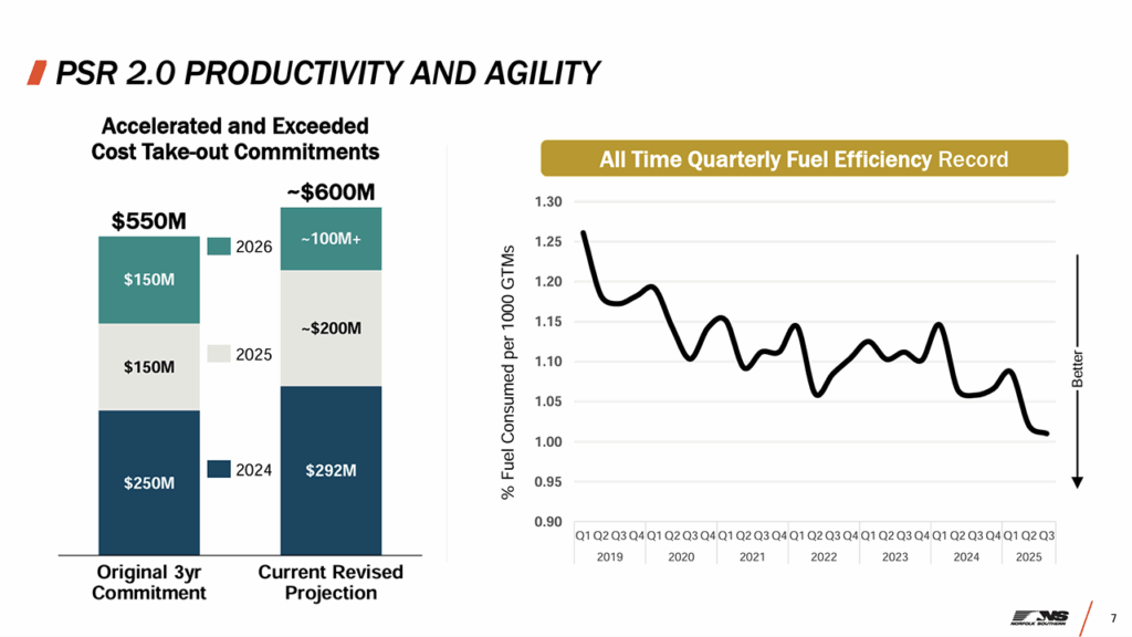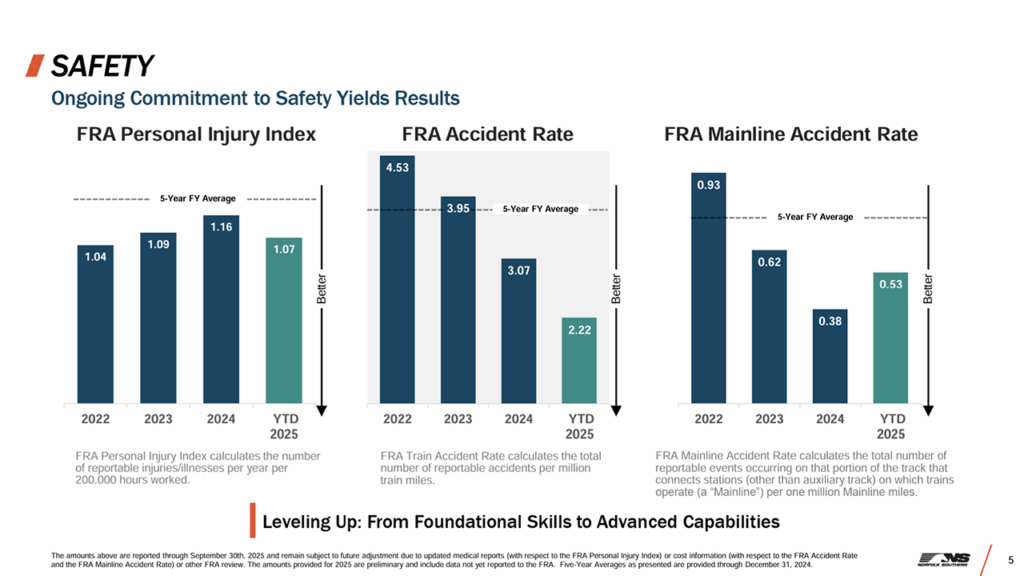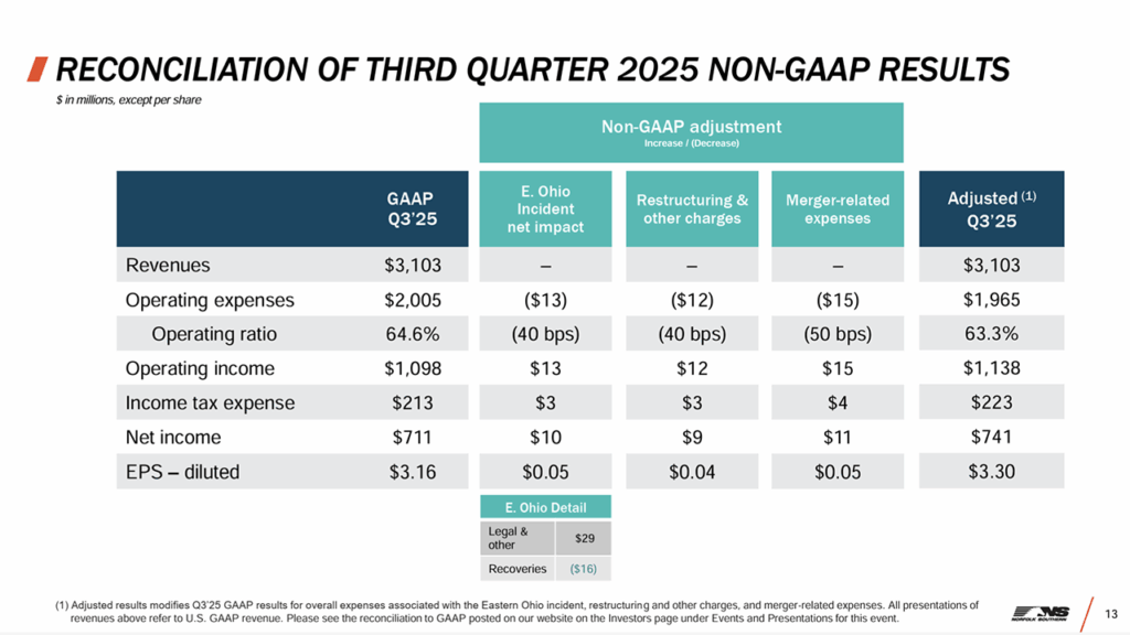 • Operating ratio in third-quarter 2025 was 64.6% vs. 47.7% in the prior-year period, which included the aforementioned railway line sales. Adjusting for merger-related expenses, restructuring and other charges, and the effects of the Eastern Ohio incident, NS said the operating ratio for the quarter was 63.3%. This represents 10 basis points of improvement from adjusted third-quarter 2024 which was 63.4%