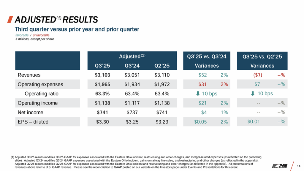 Norfolk Southern delivered another quarter of strong results on safety, service, and productivity through a dynamic freight market,” said Mark George, President and CEO of the Class I railroad, which on Oct. 23 posted third-quarter 2025 results, including income from railway operations of $1.1 billion, an operating ratio of 63.3%, and diluted earnings per share of $3.30, each of which was adjusted to exclude expenses related to its potential merger with Union Pacific; restructuring and other charges; and the effects of the 2023 East Palestine, Ohio, derailment.