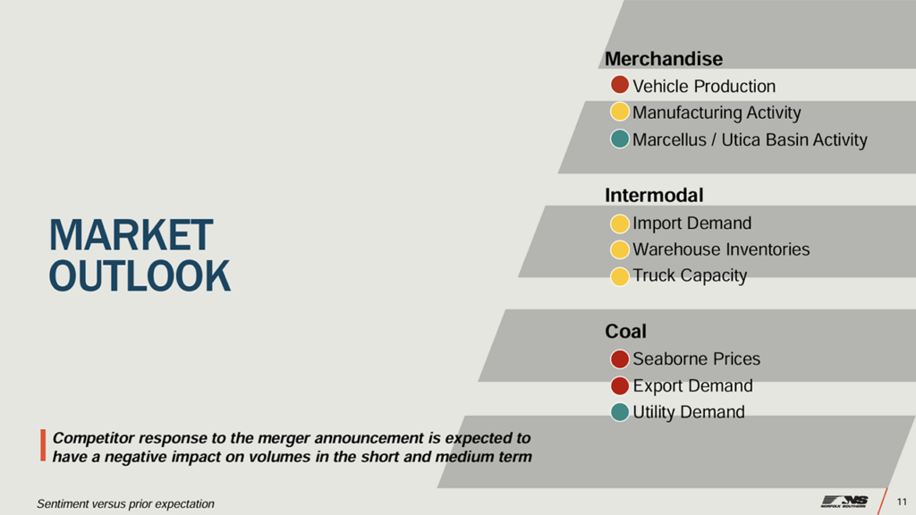 • Top-line pressure to become more evident in the fourth quarter as NS is starting to see intermodal business diversion to its Eastern competitor’s new single-line service. NS expects this pressure to persist through 2026 but further volume reconfigurations are likely as UP and NS integrate networks in 2027 assuming STB approval (which we place at 90% probability). Management expects volumes to return incrementally over a few bid cycles. We believe this is reasonable given the well-understood advantages that a merged network has over interline agreements.