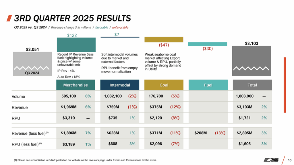• Railway operating revenues came in at $3.1 billion, an increase of $52 million, or 2%, from the same quarter last year, on flat volumes, according to the railroad. Fuel surcharge revenue declined $30 million compared with third-quarter 2024, which NS said represents a 1% headwind to overall revenues.