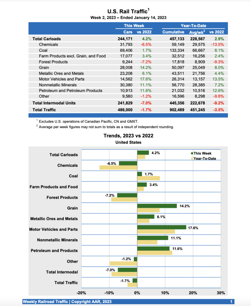 For the week ending Jan. 14 (Week 2), total U.S. rail traffic was down 1.7% compared with the same week last year; carloads came in 4.2% higher while intermodal dipped 7.0% compared to 2022, according to the Association of American Railroads’ (AAR) Jan. 18 report.