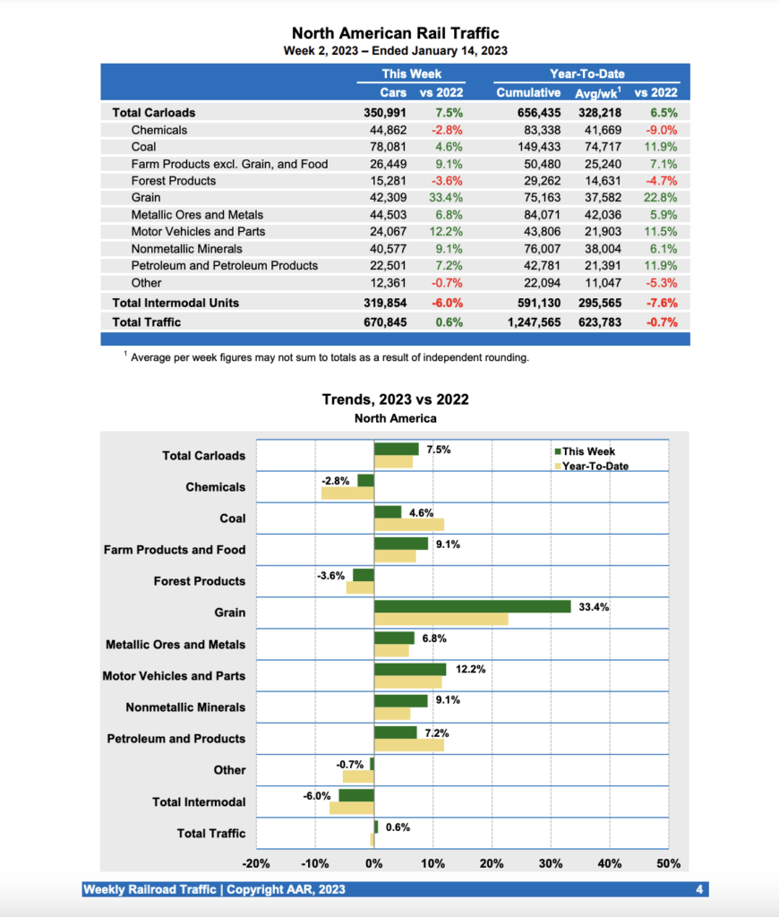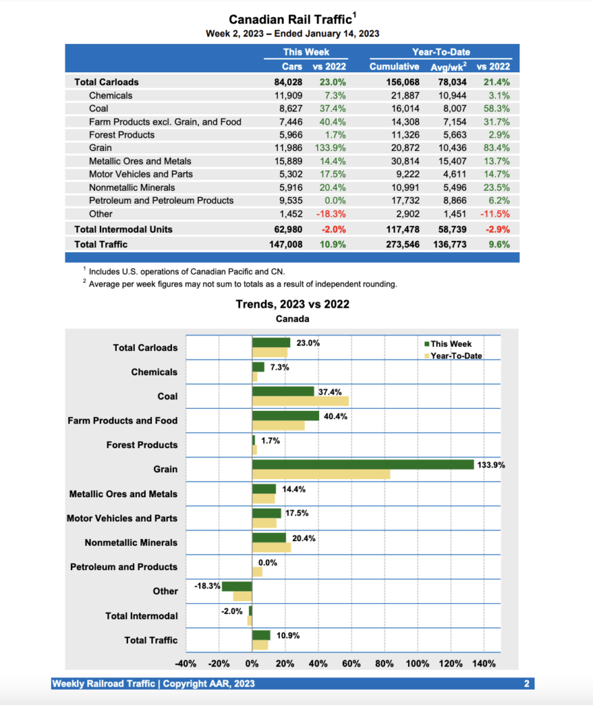 Canadian railroads reported 84,028 carloads for the week, up 23.0%, and 62,980 intermodal units, down 2.0% compared with the same week in 2022. For the first two weeks of 2023, Canadian railroads reported cumulative rail traffic volume of 273,546 carloads, containers and trailers, up 9.6%.