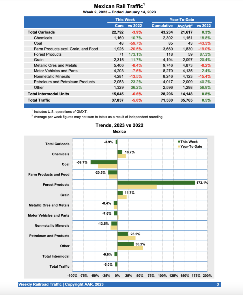 Mexican railroads reported 22,792 carloads for the week, down 3.9% compared with the same week last year, and 15,045 intermodal units, down 6.6%. Cumulative volume on Mexican railroads for the first two weeks of 2023 was 71,530 carloads and intermodal containers and trailers, up 0.5% from the same point last year.