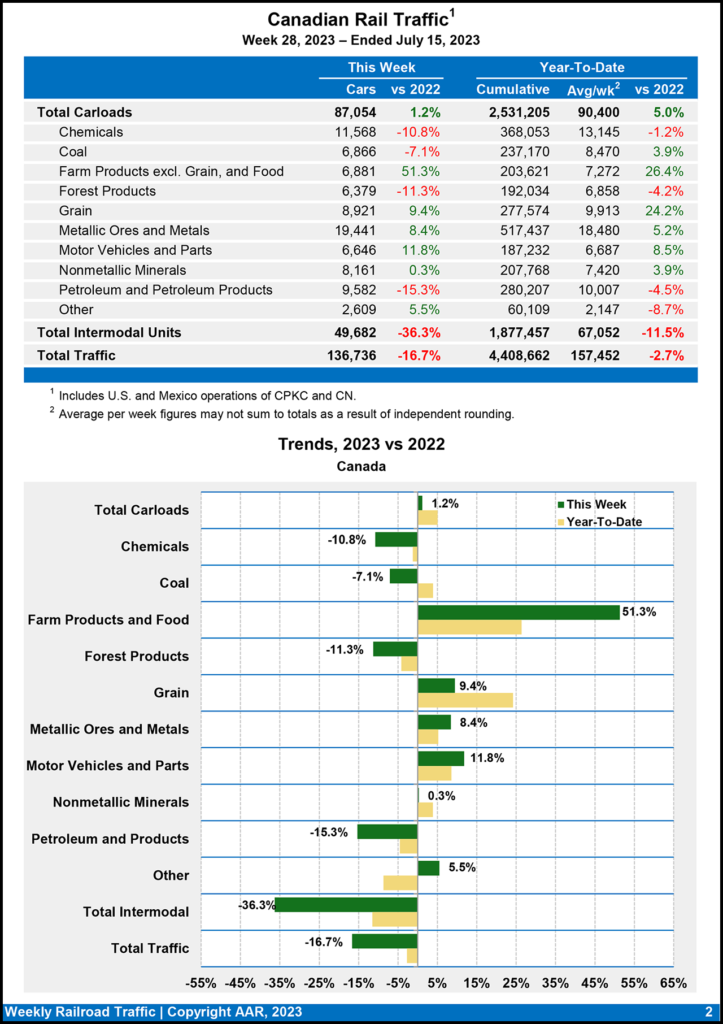 Canadian railroads reported 87,054 carloads for the week ending July 15, 2023, up 1.2%, and 49,682 intermodal units, down 36.3% from the same point in 2022. For the first 28 weeks of this year, they reported cumulative rail traffic volume of 4,408,662 carloads, containers and trailers, down 2.7%.
